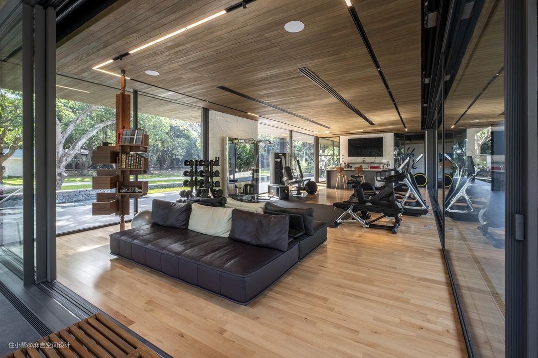 ③注意与其他房间的空间关联性。健身房的设计应当尽量位于房间的活动空间,不要临近书房,卧室等对声音要求比较高的场所,也可以将更衣室,淋浴间等因素考虑进去,方便健身结束后快速换洗。