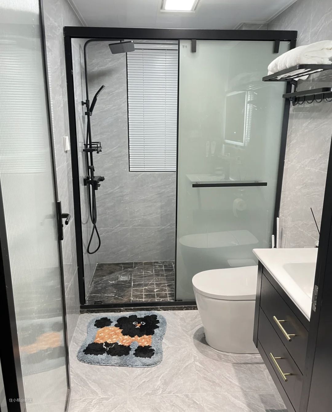 更精细化一些的是:玻璃的面积可稍微小一些,卫生间内的人,会更有隐私感。