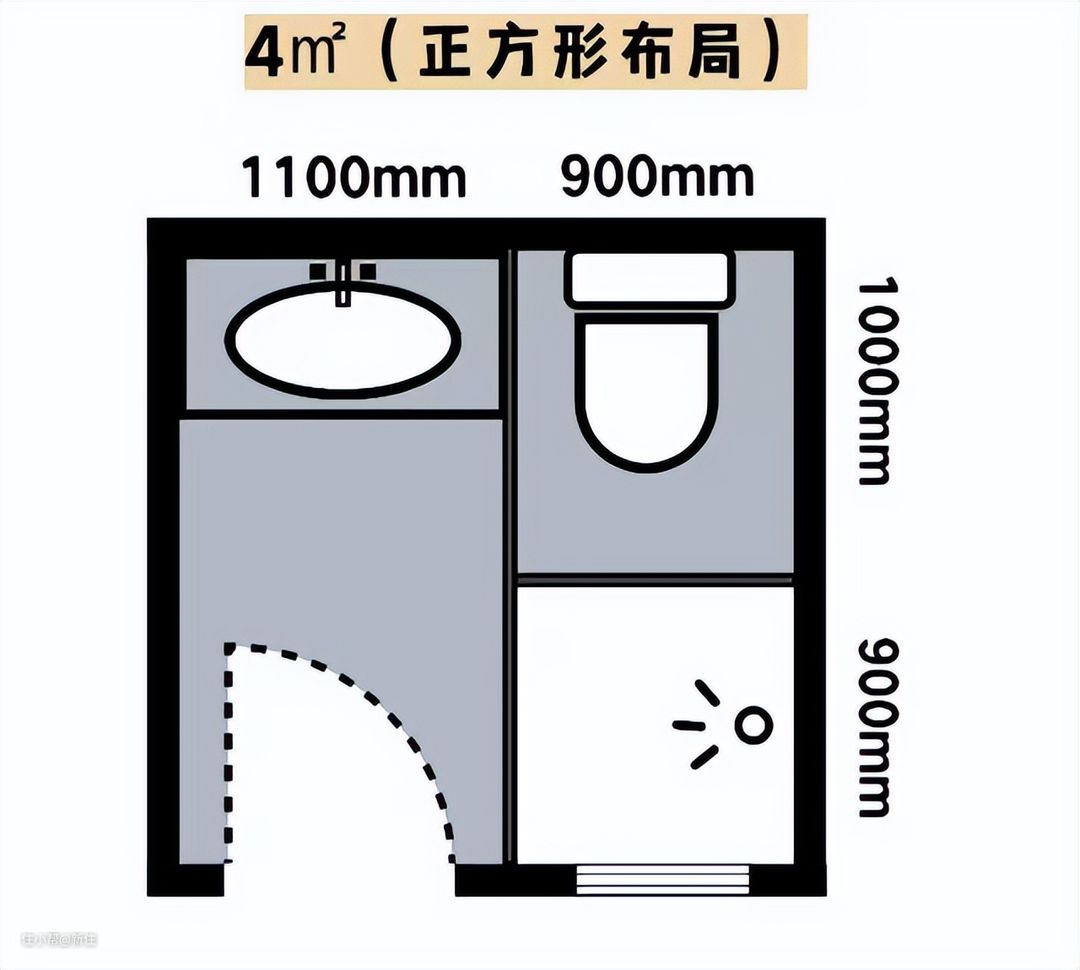 别看卫生间小小一个方形空间,就布置一个马桶、洗手盆、淋浴区,但其实有很多的讲究在里面,下面以一个常见的4平米正方形的小洗手间为例展开讲讲:
