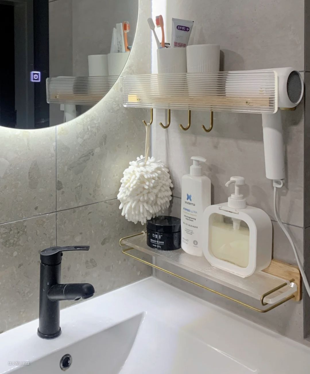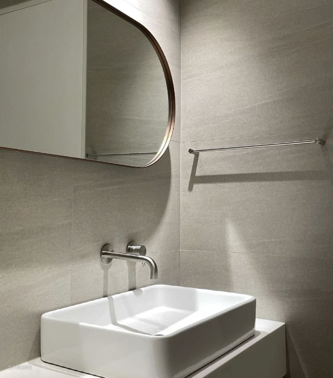 浴室台面的侧面墙体,是一个非常顺手的收纳区,此处用来收纳使用更高频的毛巾、牙刷、剃须刀等更方便。
