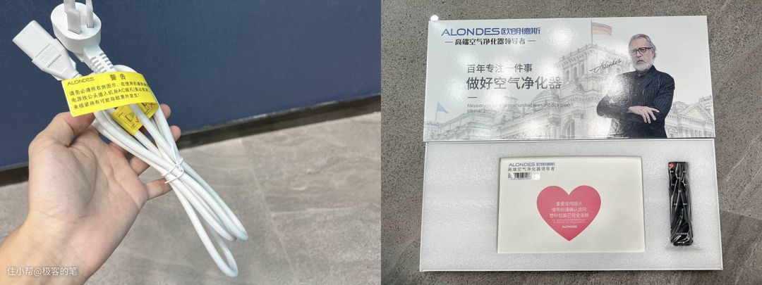 和很多大家电一样,欧朗德斯M9空气净化器的外包装也采用了纸箱,包装外面有简单的产品图案,没想到里面还有一层包装,而且再里面还有泡沫保护,机器被保护得很好,整个包装加机器还是很有分量的。
