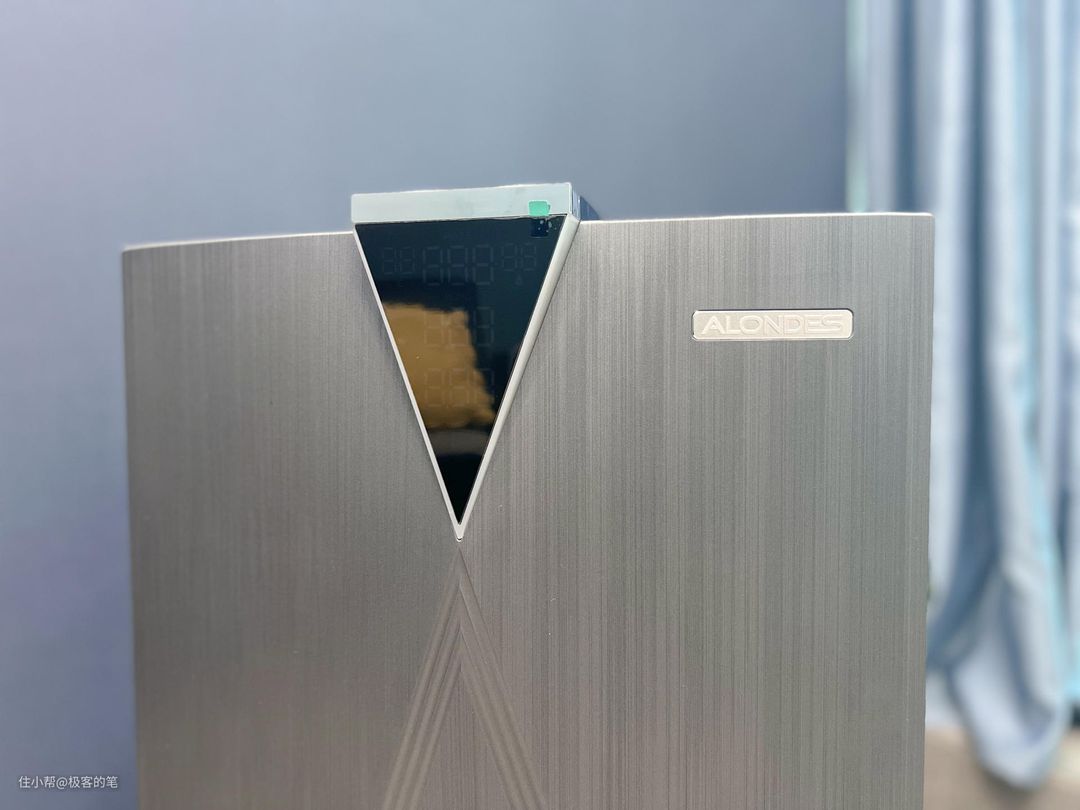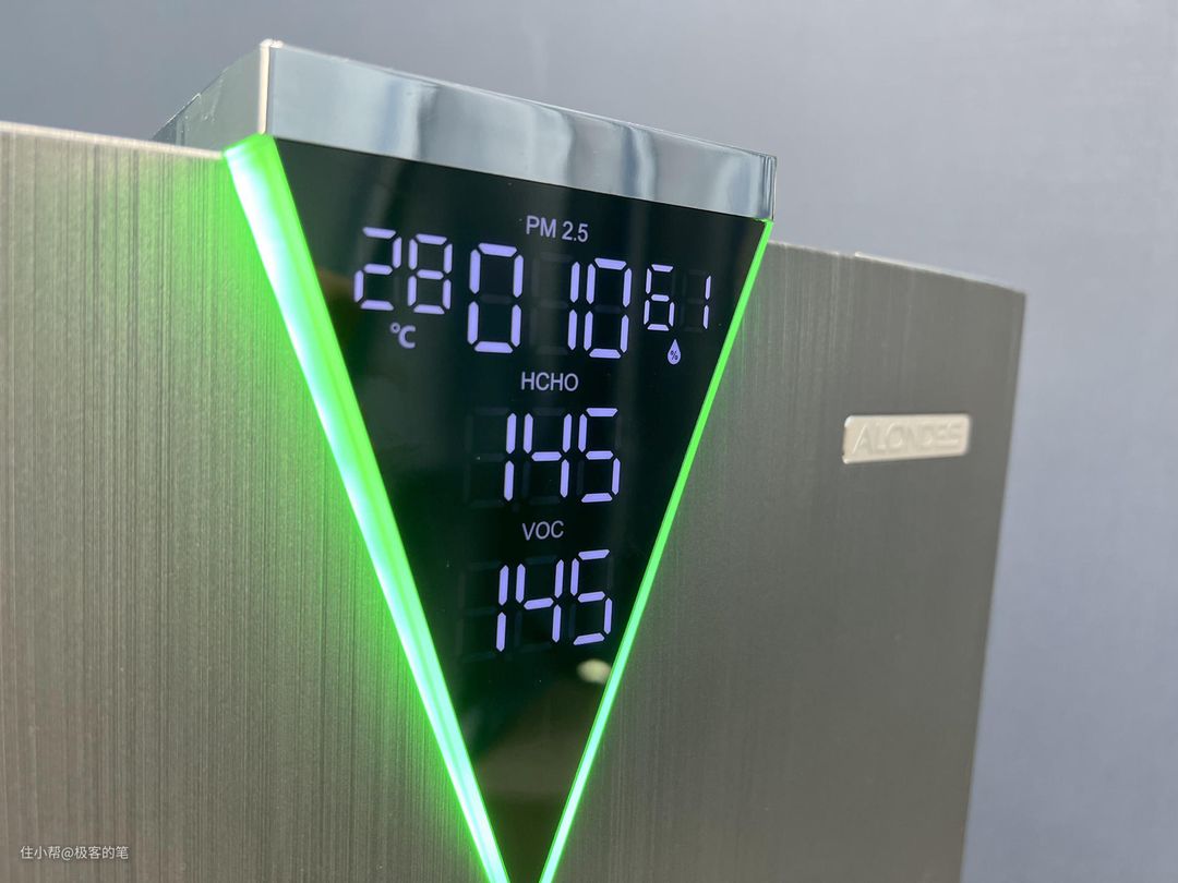这块三角形的显示面板是凸出于机身的,很有设计感,在显示面板上可以显示PM2.5、甲醛、VOC和湿度等空气信息,显示功能还是比较齐全的,在开机的情况下还可以设置24小时内的定时,每按一次增加一小时。面板采用金属拉丝工艺,经过127道工序流程制作出如超跑车身上的碳纤维机身质感,显得比较有高级感,在右上方有一个产品的logo。