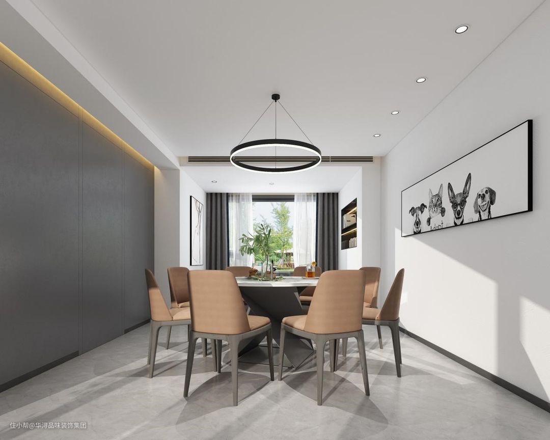餐厅一侧墙面全部采用深灰色护墙板拼接而成,在其表面没有任何的多余装饰品,将灰色的大气与简约发挥的淋漓尽致。