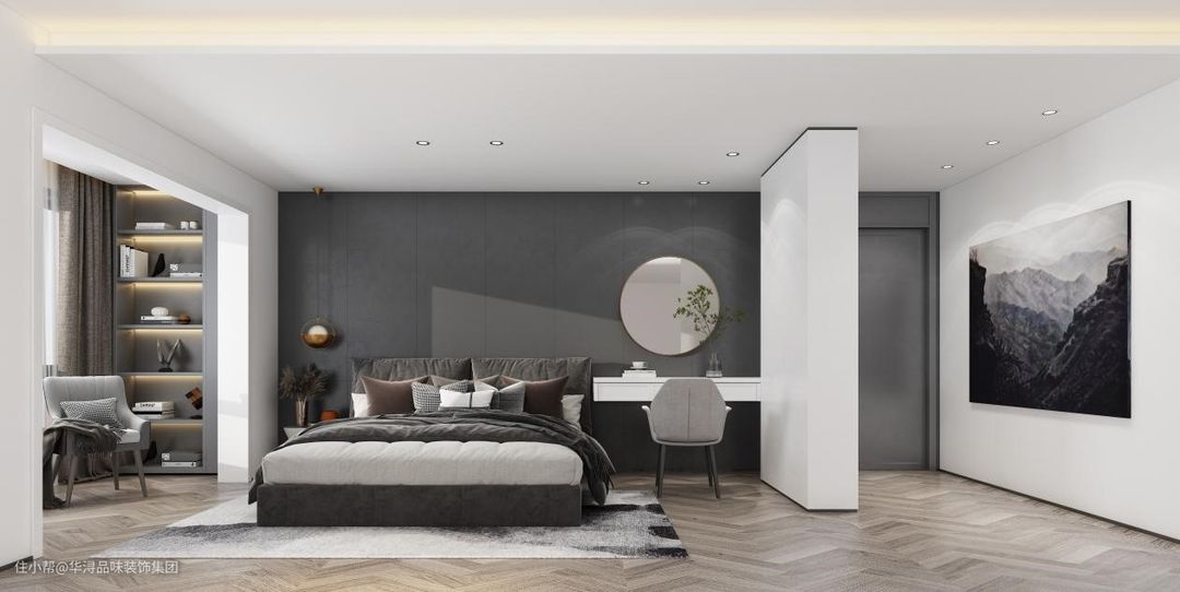 灰色壁布贴满了整面床头背景墙,使得主卧看上去更素雅高贵。