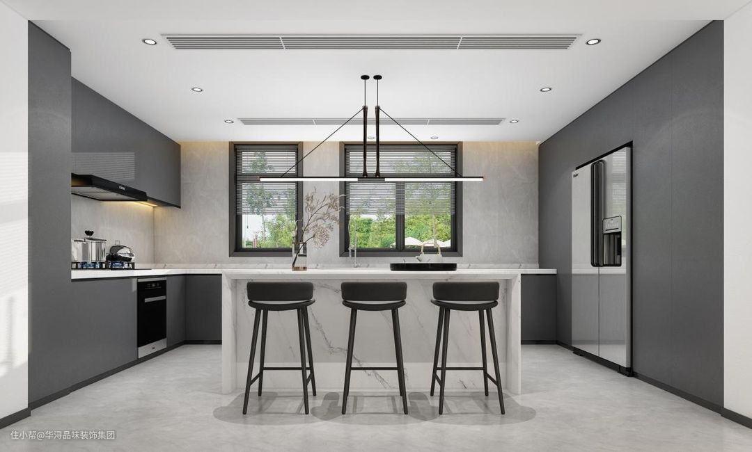 厨房中间打造了一处简约造型的吧台,白色大理石台面易于卫生打理,同时搭配了黑色金属造型的高脚凳,使这里能够成为一处休闲之地。