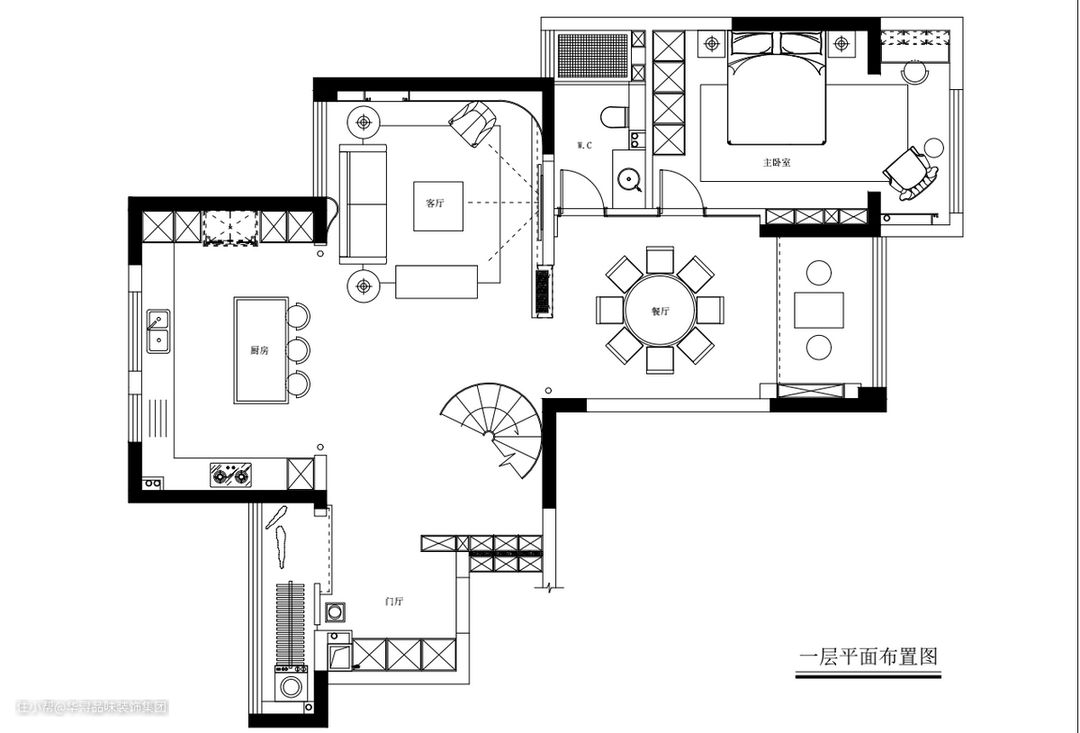一款弯曲圆形的垂线式主灯,在白色的基础色调上特别显眼,黑白配果然永不过时。