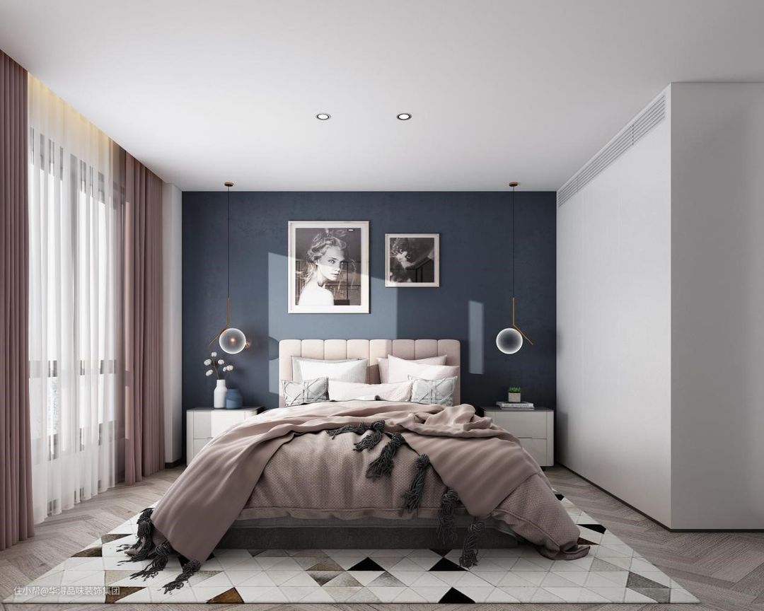 设计师采用现代极简风作为设计主线,在房间内部大量采用白色乳胶漆通刷,形成大量的留白工艺效果,形成一种大气时尚质感,同时一些轻奢风格的家具和新中式风格的壁画融入也让房间里碰撞出两者和谐的火花,体现出一种时尚、美好、舒适的自在生活。