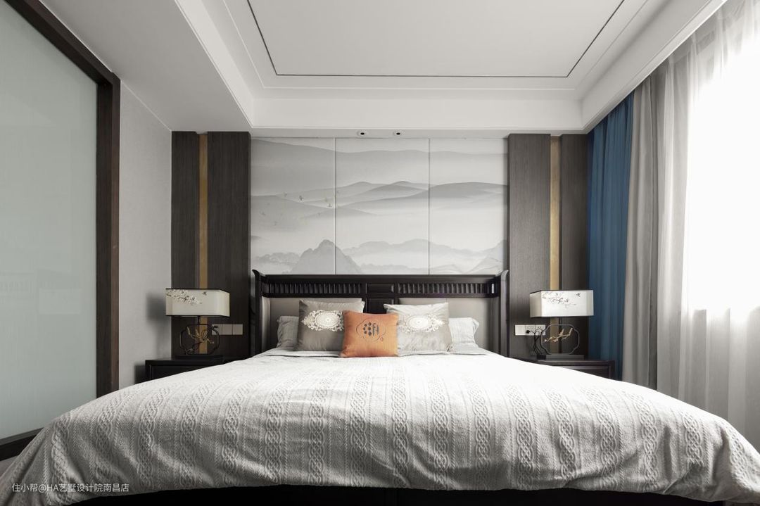 在床头背景墙中间,使用传统的山水画作为空间的装饰,画作中的群山磅礴大气,更让主卧室显得沉稳端庄。在床上,选用了丝绸面料的抱枕,并且其中一只用了橙黄色,既利用丝绸强化了传统文化神韵,又利用橙黄色的鲜艳让空间更具有活力。