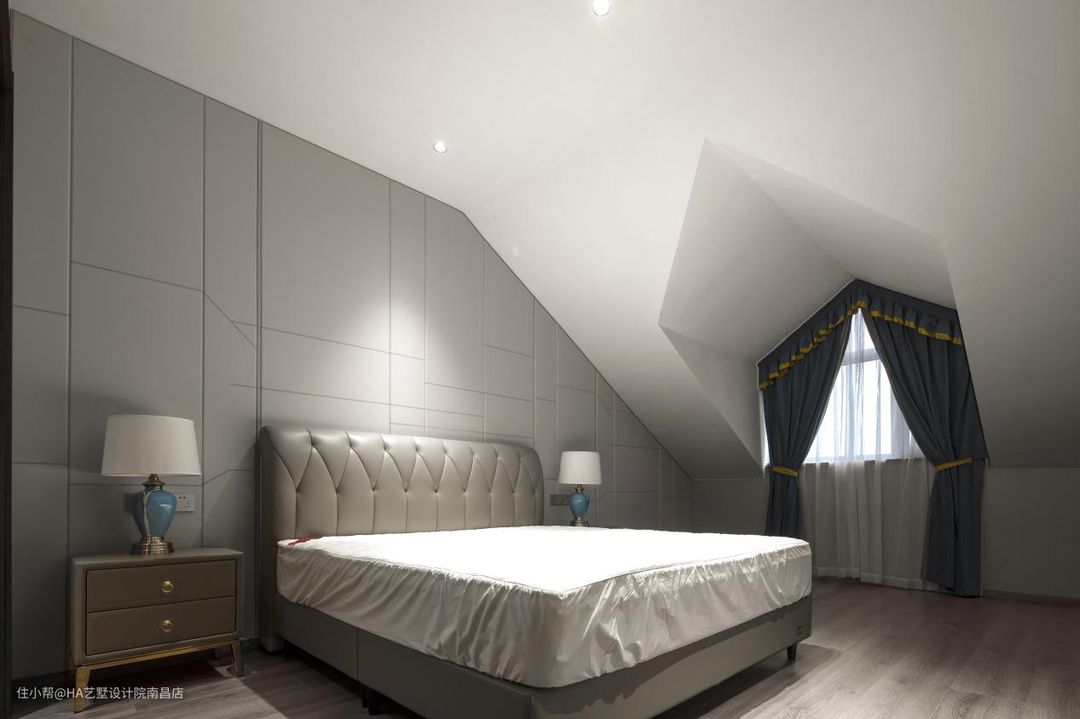 次卧设置在顶部的阁楼上,由于此处的房顶有一定的坡度,所以在设计时,特意在窗户前的位置上多做了几个带直线的转折,这样不仅打破了斜面棚顶带来的压抑感,还能利用这些带直线的几何造型让空间更有现代感。