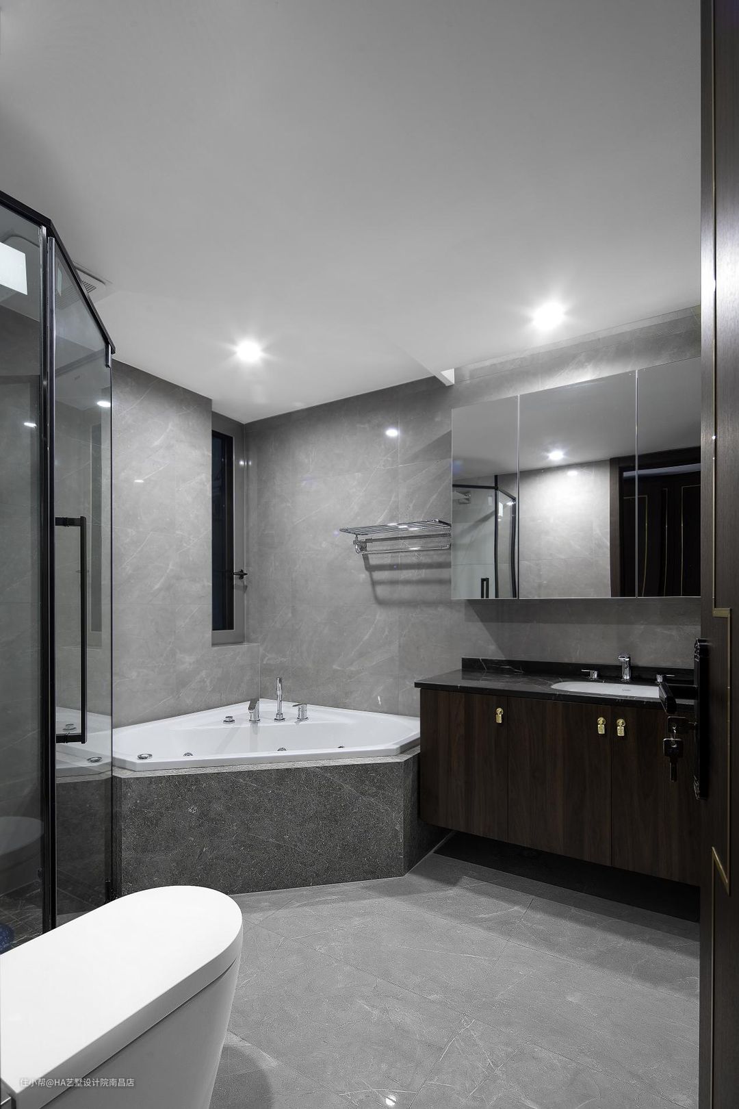 根据业主的使用需求,设计师在主卧卫生间的一角摆放了一个大号的浴缸供业主泡澡休息使用。另外,在浴缸旁边同样保留了淋浴区,为业主提供了更多种类的洗浴选择。浴缸右侧则是一个定制的水盆柜,水盆柜选用棕色面板加铜艺把手,将中式元素带入主卧卫生间中。同时,这个水盆柜底部悬空,这样反人类直觉的设计方式让这里带上了现代感。整个卫生间自然采光很少,因此在吊顶部位选用了白色灯光的筒灯对卫生间进行照明。