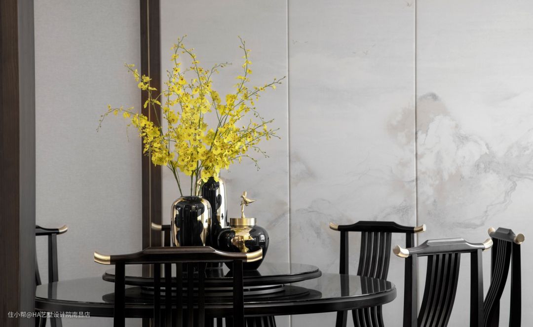 在餐桌的顶部摆放金黄色的插花作为餐厅空间色彩最丰富的装饰品,打破了黑白色调空间的单调,为餐厅增加了生机和活力,让用餐的环境氛围更加轻松。