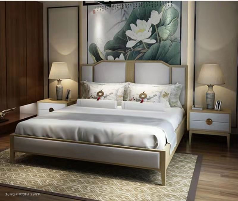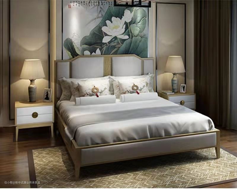 哑光质感的卧室勾画出房间应该有的温柔姿色,背景墙一幅题字荷花壁画,色调都淡然优雅,把卧室烘托得更加温柔和缓。