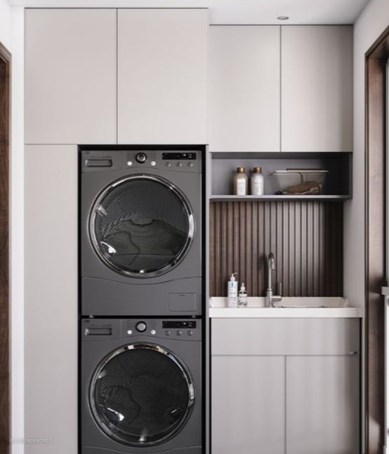 除了洗衣机、烘干机之外,台面,洗手台,储物柜,存放扫把拖把洗衣机的工具柜,都可以一样不落: