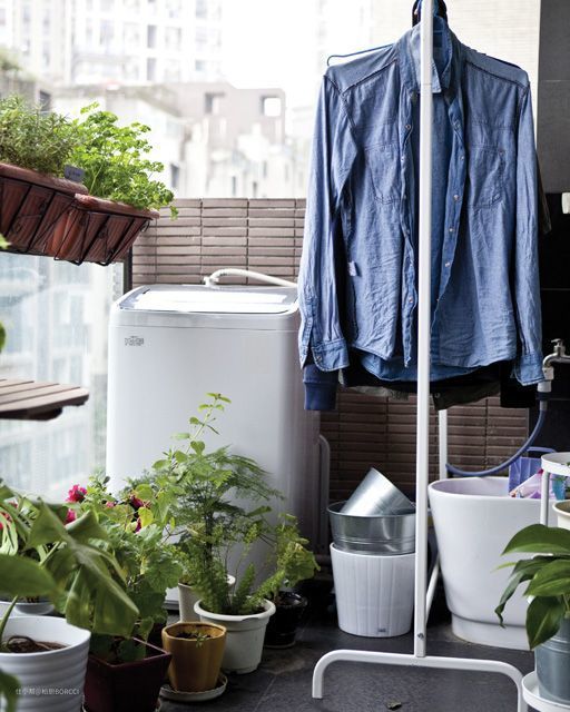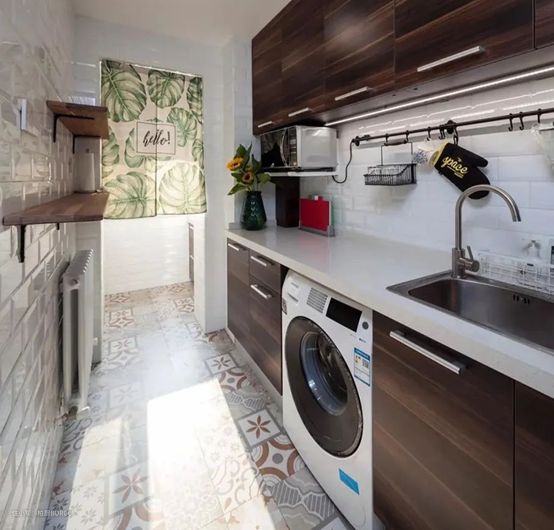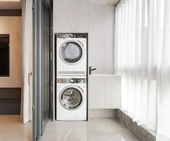 (滚筒洗衣机,往往更适合这样孤零零地布置在一个角落,较难与其他功能区有机结合)