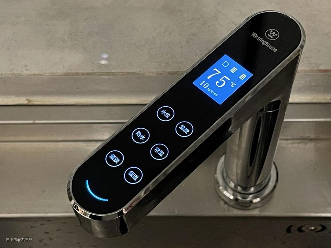 因此各种指示灯最好选择位于龙头的设计,而不是位于主机的设计。可以看着这个数显彩屏龙头就集合了各种相关数据,你可以一目了然的了解到水质、滤芯寿命以及工作状态等常用数据。并且还可以直接调节温度和水量,使用起来十分方便。