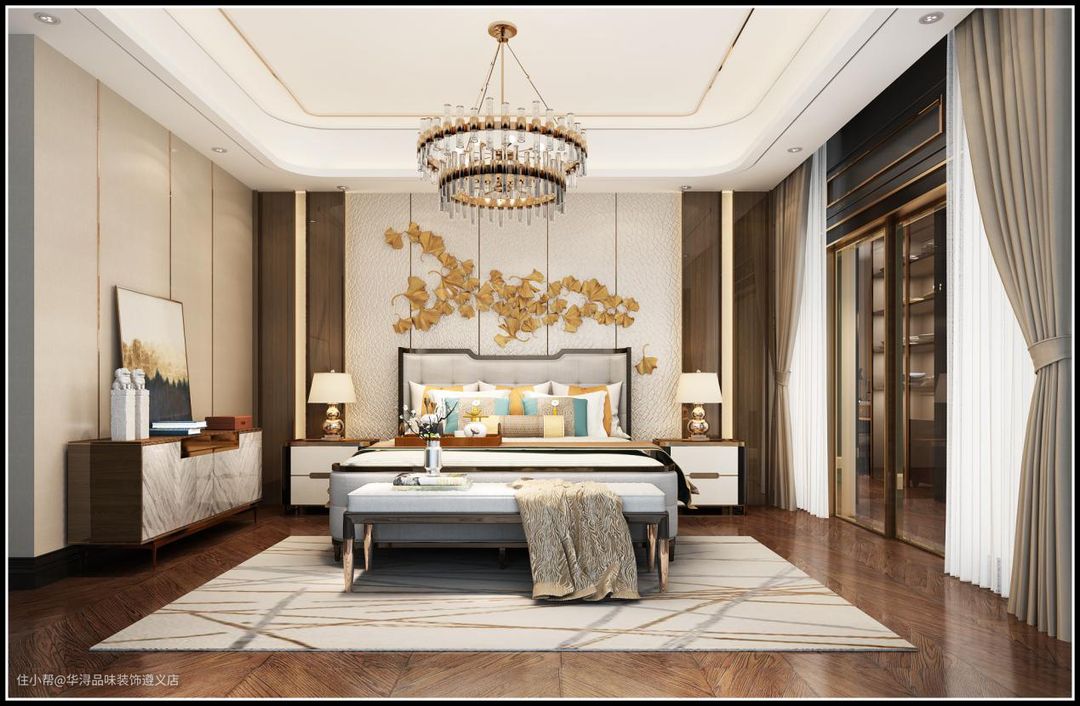主卧室选用棕色实木地板,四周的墙壁也是用了米黄色的硬包进行包裹,打造出一个色调更暖、更有温馨感的卧室空间。