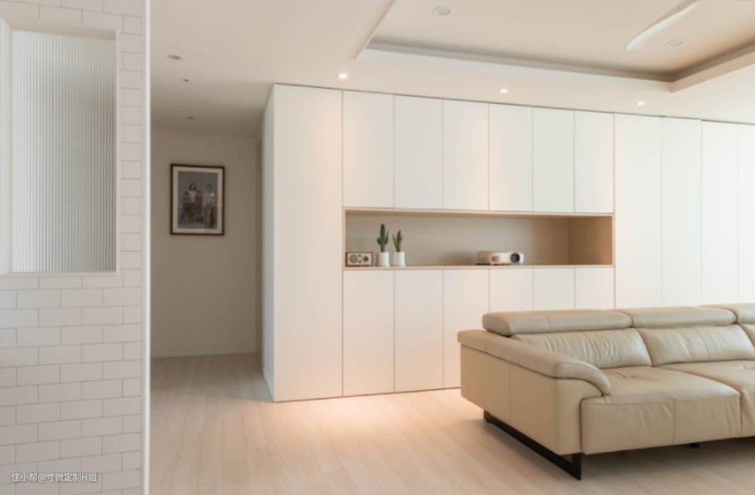 整面收纳柜不仅极大程度上增加了收纳空间,无把手柜门的设计也不会让空间显得压抑拥挤。可以把伸手就能碰倒的位置设计成开放式置物区,坐在沙发上随手放东西很方便,把茶几都省了,让空间更显宽敞。