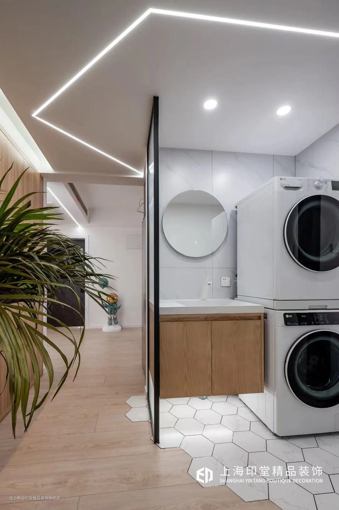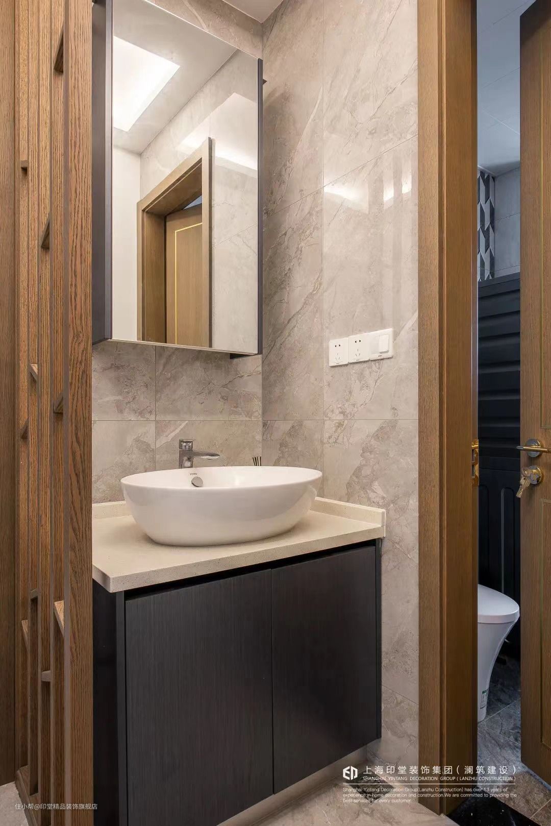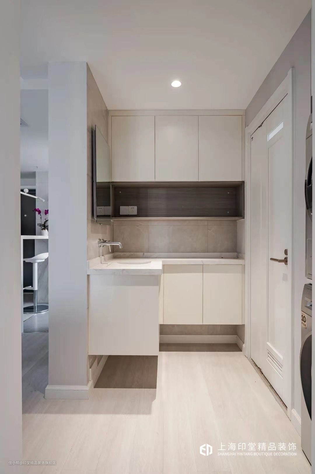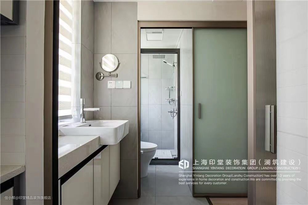 如果过道区域的采光与空间充足,直接洗手盆侧边砌墙到顶做隔断,这样的空间简洁自然,非常的大方端庄。