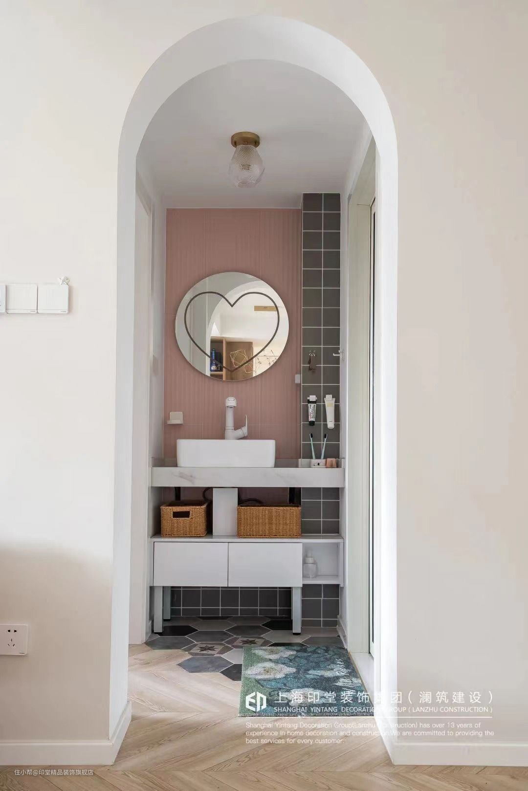 不过这个时候就需要在其他地方花点心思,例如撞色的背景瓷砖,拱门设计,都是不错的加分项,让卫生间整体看上去更美观、大气。