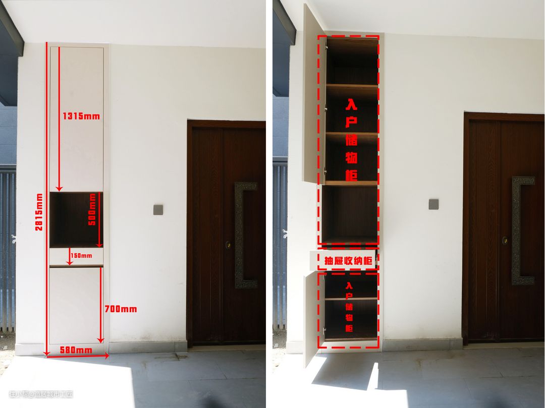 以入户门为中心点,门的右侧就有一处空白墙面可以利用来做储物柜,嵌入式长条形柜子,半封闭式半开放式设计,高度是2815mm,宽度580mm,可以充分满足这个区域的储物需求。