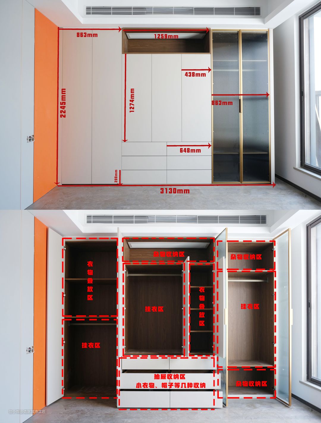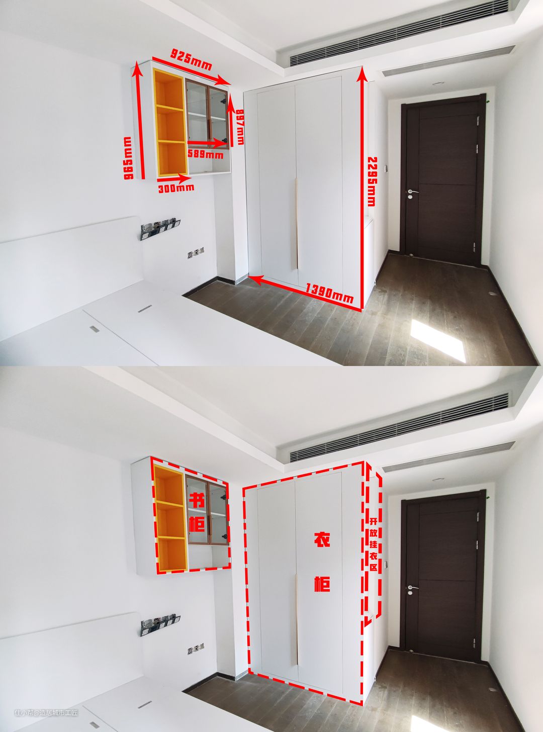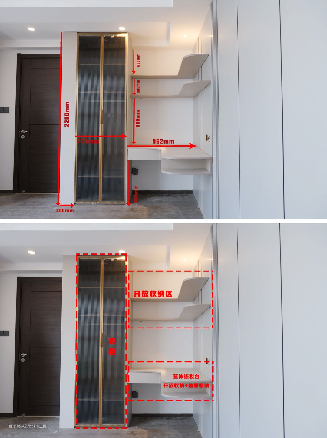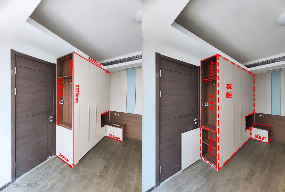 敲重点!定制柜最重要也是最需要注意的点,就是它的尺寸,不管做什么样的定制柜,柜子的尺寸都要根据空间尺寸进行定制,才能在最大化利用空间的情况下,做到严丝合缝的收纳。