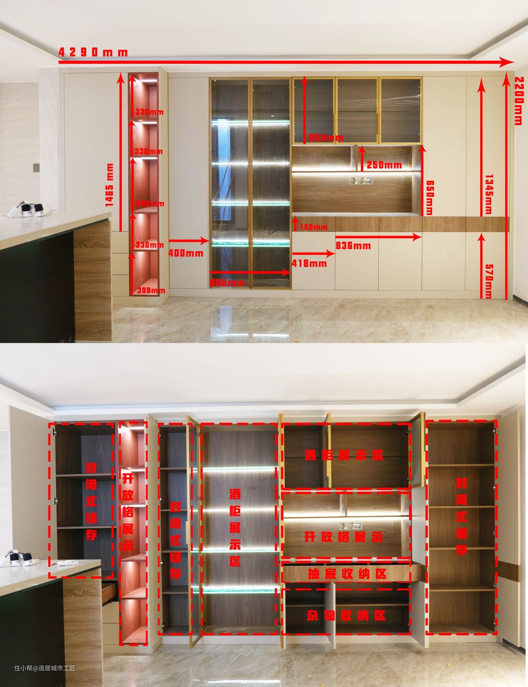 餐边柜总宽4290mm,高2200mm,分封闭式储物、开放格展示、酒柜展示区、杂物收纳区和抽屉收纳区,搭配无把手的柜面设计,释放出对生活的无限美好期待。
