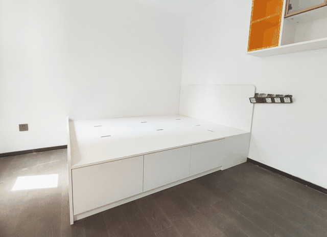 榻榻米部分是由长2036mm,宽1500mm的床板和高400mm、长2036mm的储物柜组成,除了可以休息以外,床侧面空间还可以收纳,简洁又舒适。
