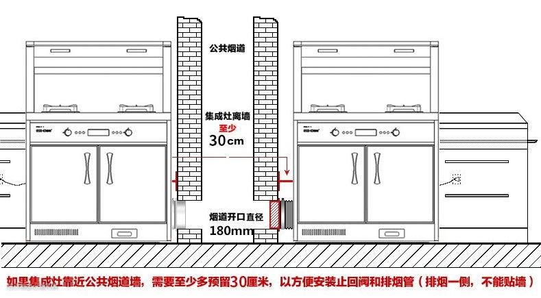▲一般房屋开发商在设计房屋的时候,都是按照普通烟灶留的排烟孔,位于厨房拐角处的上方,直通公共烟道。而集成灶由于是下进风设计,所以需要在墙壁上重新打孔开一个烟道,并把之前的烟道封起来。并且,由于集成灶是与橱柜连接着,所以在设计橱柜前就需要确定好集成灶的型号,以方便橱柜尺寸的确定。