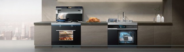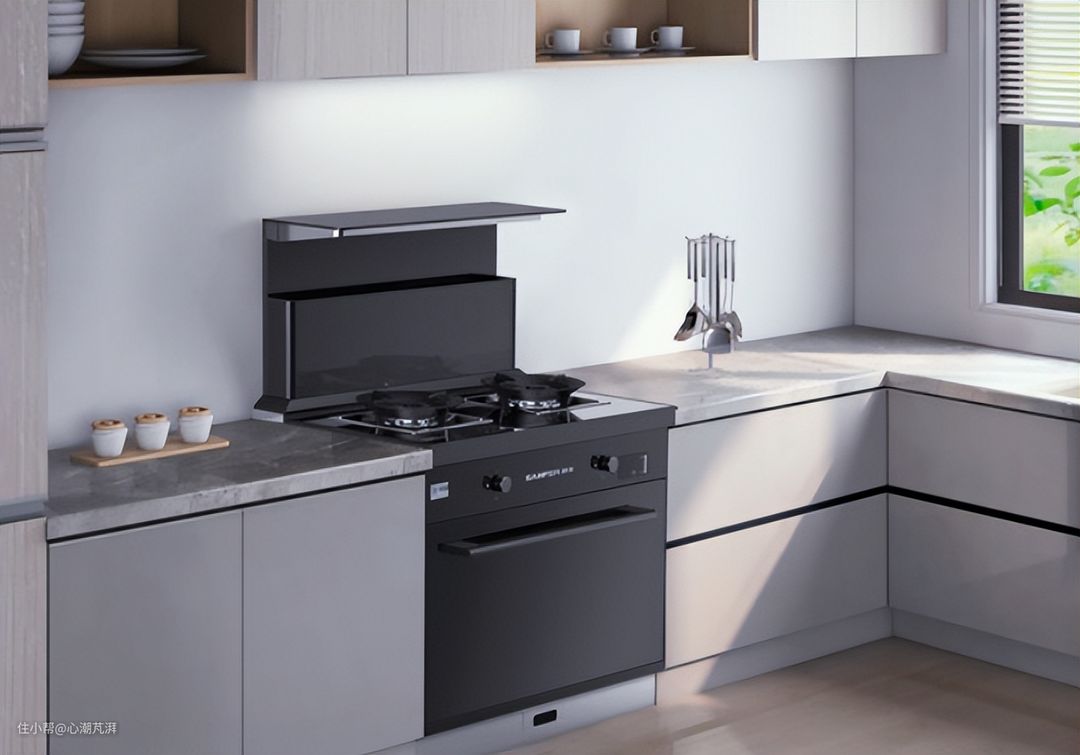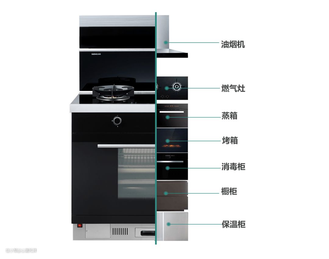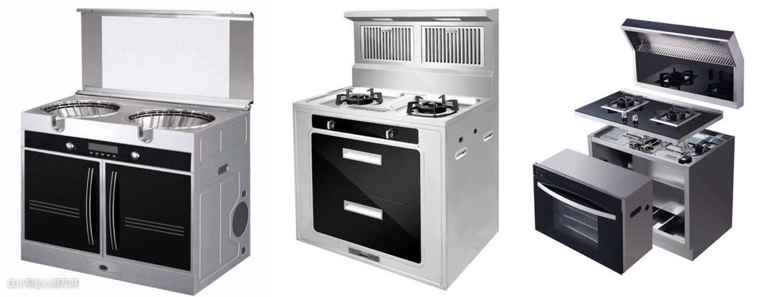 ▲从字面意思上看,集成灶的一大特点就是它的功能集成性。每一阶段的集成灶都包含了烟机和灶台基础功能,附加功能从最早的储物柜,再到后来的消毒柜、蒸烤箱、洗碗机的搭配。集成灶的出现方便了小伙伴们不需要分别购买烟机、灶台,也不用费力去设计嵌入式蒸烤箱、洗碗机及橱柜台面。