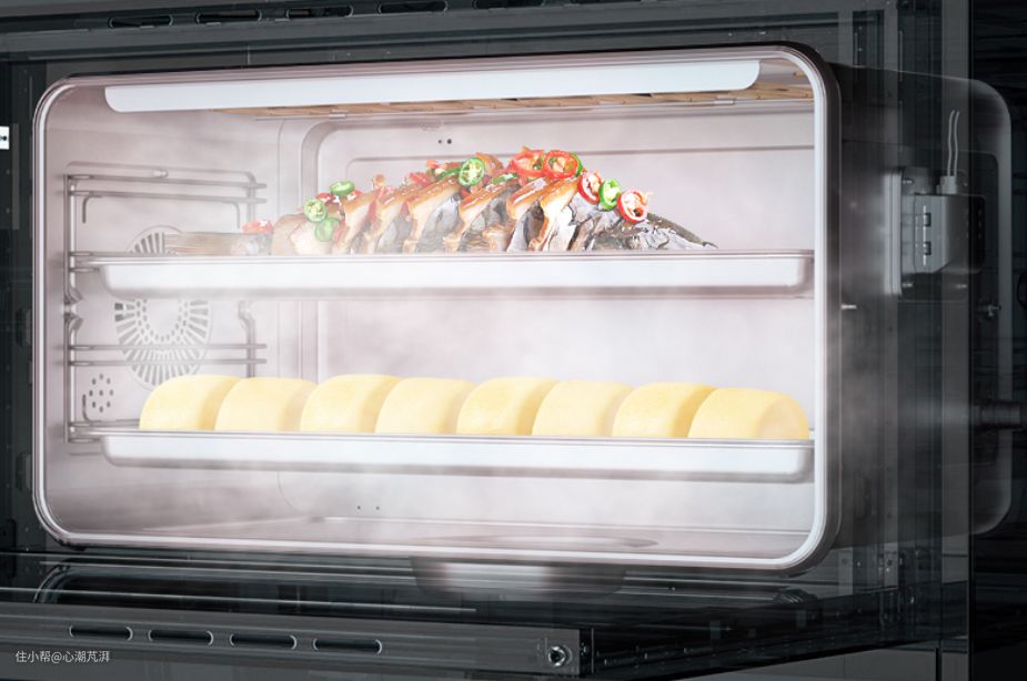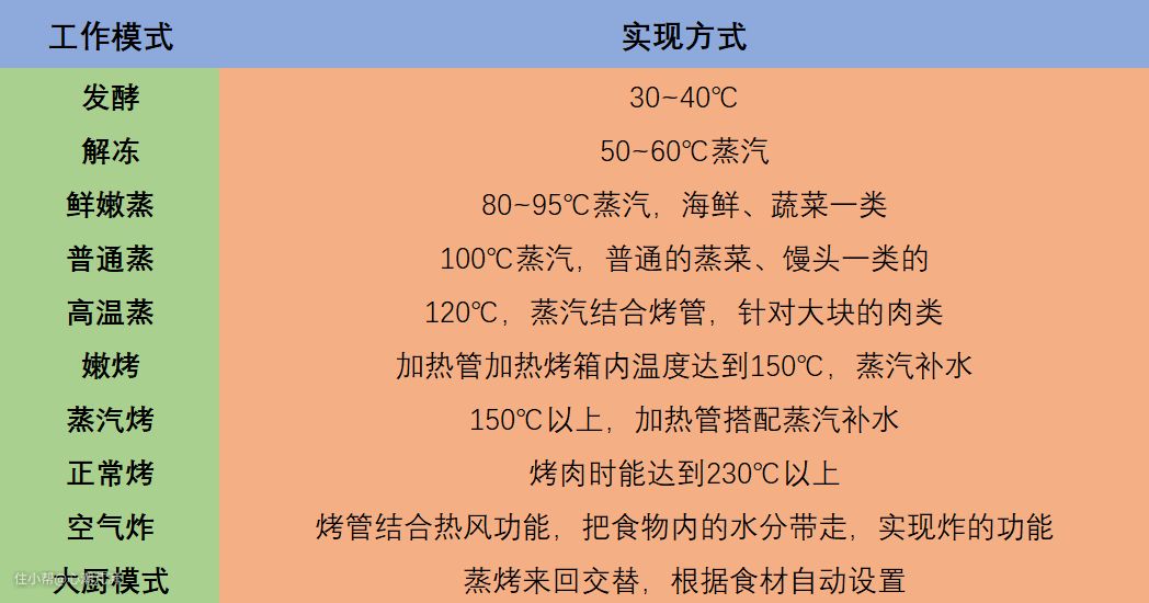 ▲蒸烤集成灶的工作模式主要是蒸和烤,同时还有细分的嫩烤、高温蒸、空气炸等工作模式,主要是你用了不同加热管、蒸汽与热风功能的配合,丰富了烹饪方式。