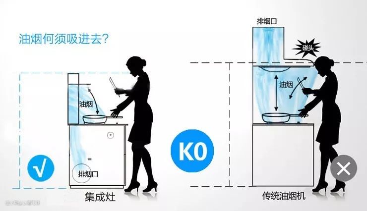 ▲一般厨房灶台的高度在0.8m,传统的烟机安装高度普遍在距离灶台0.65~0.75之间,也就是距离地面高度在1.45~1.55之间。家里做饭的通常都是女同志,个子高了容易碰头,个子矮一些油烟扑面。毕竟咱炒菜的时候还需要弯一弯腰,大多数人的面部都处在油烟的升腾区中。并且由于烟机距离灶台相对比较远,还容易造成油烟的逃逸,这也是很多人抛弃传统炉灶,选择集成式烟灶的原因之一。