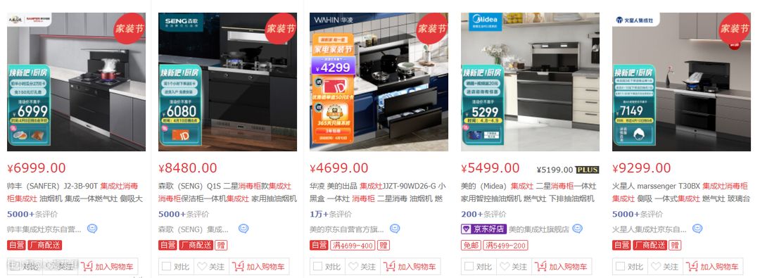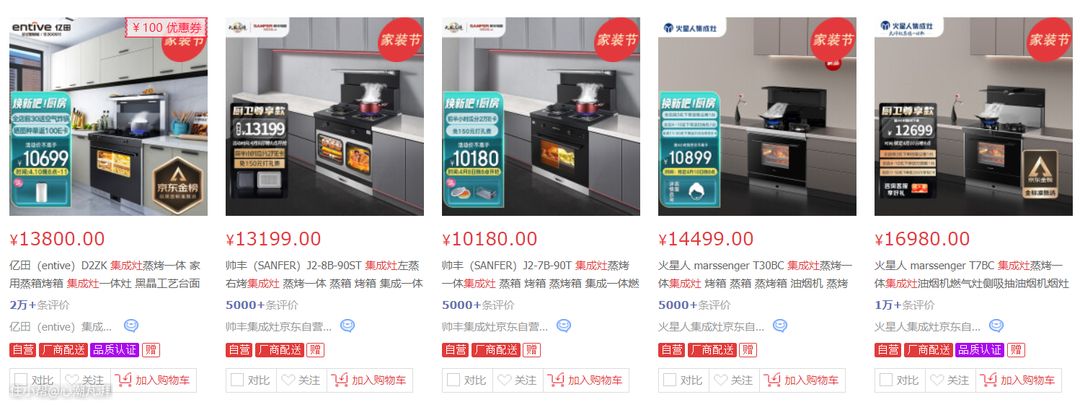 ▲集成灶的价格是很多人放弃选择集成灶的原因之一,在某东上搜索蒸烤式集成灶,可以发现销量排在前面的几款最低价都超过了1W。