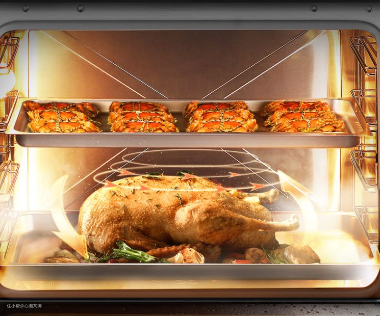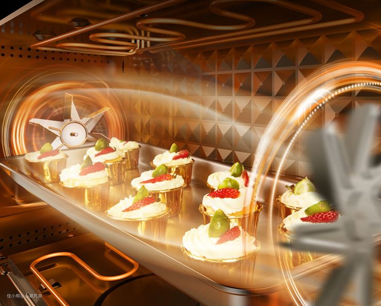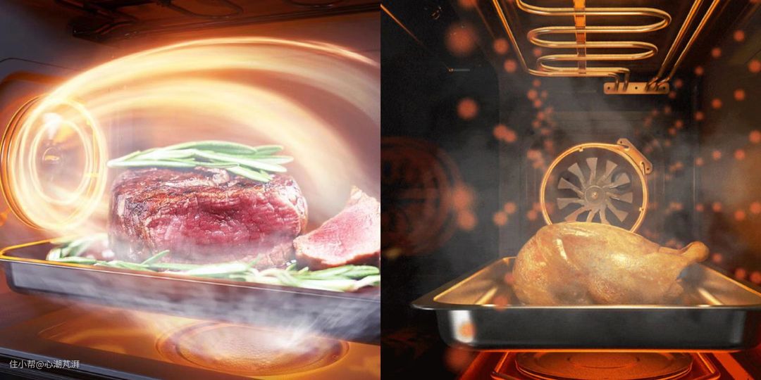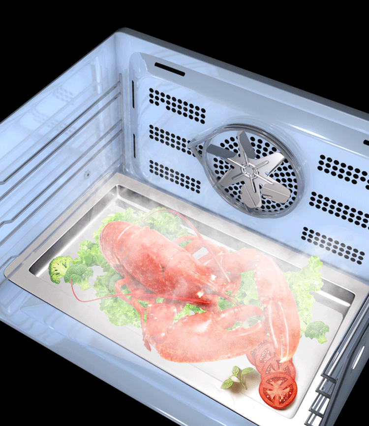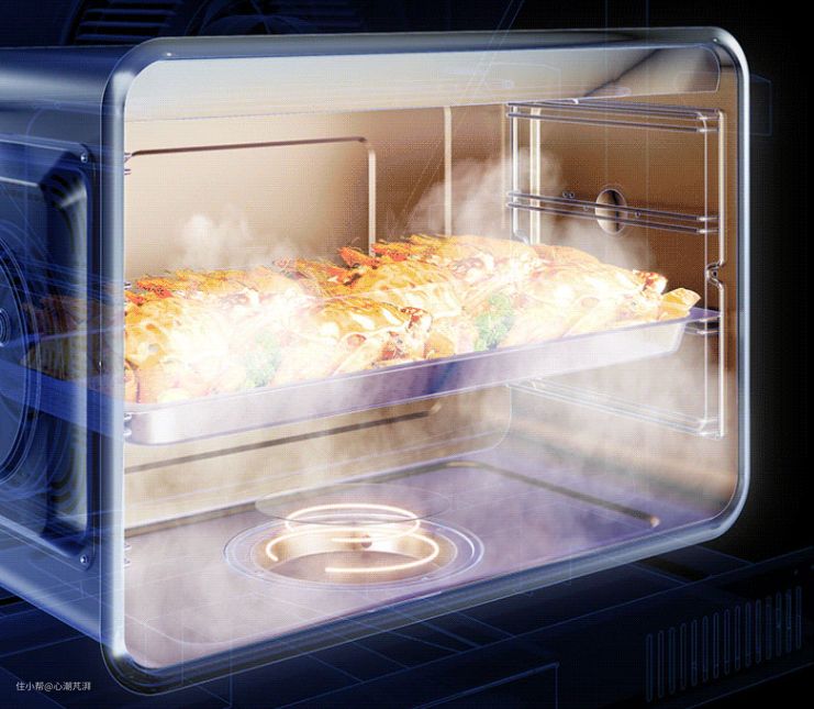 ▲同时左右两边各有一个风扇,双热风模式使得蒸烤箱内的热气流循环的更快,360°对食物进行加热。
