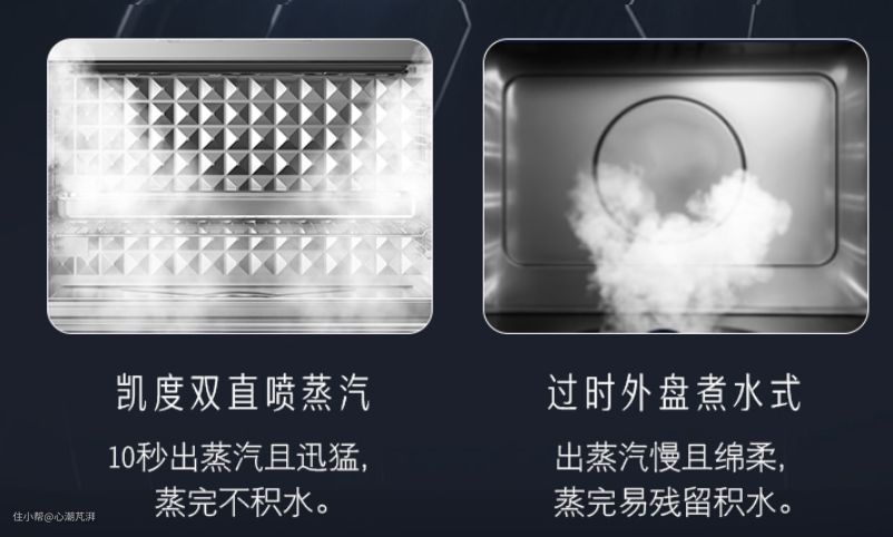 ▲这种方式的蒸汽是在蒸烤箱的内腔外生成,在烹饪的过程中,蒸汽进入烤箱内,能够比较迅速且均匀的升高蒸烤箱内的温度。蒸汽的产生也不是在外部单纯加热形成蒸汽送进来就行,水质的净化除垢以及蒸汽发生装置都是需要一定的技术积累的。目前做的比较好的品牌主要有凯度、老板、美的、西门子几家,其中直喷式蒸烤一起集成灶有凯度以及老板刚出的一款。