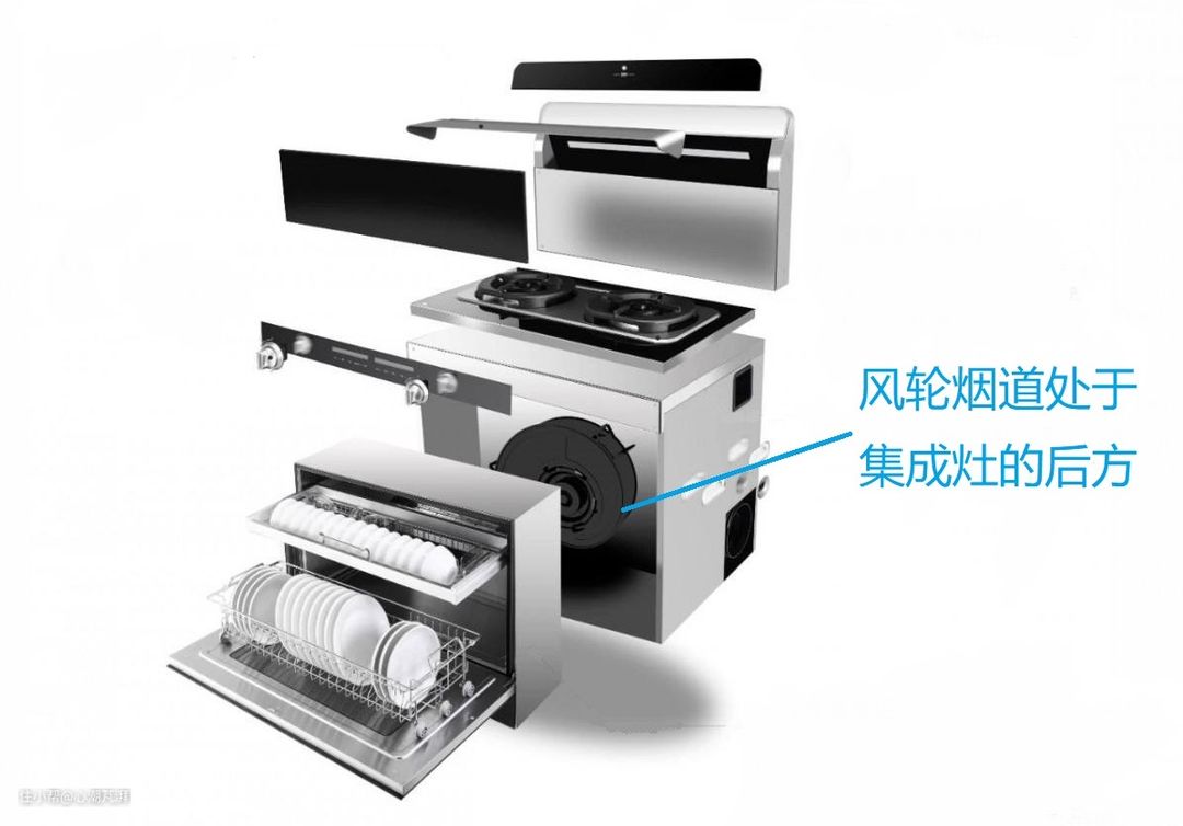 ▲肯定有不少小伙伴们要说了,下进风的集成灶同样也占用了下柜的空间。是的,没错。但是由于集成灶采用的是集成化,通过布局,空间安排比较紧凑,电机风轮一般都设计在集成灶的后方,也就是蒸烤箱或者消毒柜的背部。而普通的烟机的电机和风轮则是在正中位置,然后用一个铁皮装饰罩罩起来,其空间利用率远远低于集成灶。并且,相对于下柜,上柜的利用率以及方便程度更高。