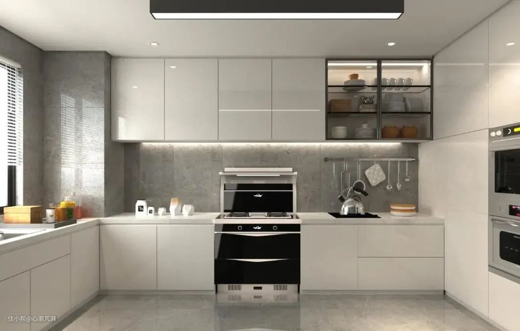 ▲由于集成灶采取的下进风,风机及管道不占用灶台上部空间,在设计橱柜的时候可以采取一体化顶柜的设计,美观实用。