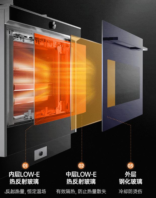 ▲蒸烤箱的柜门正对使用者,其设定的安全性十分重要。集成灶柜门的隔热,不仅是保障炉内温度不流失,更主要的是不会烫伤使用蒸烤箱的消费者。现在市场上比较好的集成灶一般会采用3层的钢化玻璃,其中有1层或2层为LOW-E低温隔热玻璃,可阻挡腔体内因加热而产生的红外线,起隔热保温作用。安装了LOW-E玻璃的柜门能够保证工作时门体不超过40度。一些厂家为了降低成本,选用劣质玻璃,不仅不能起到隔热的作用,还存在安全隐患。
