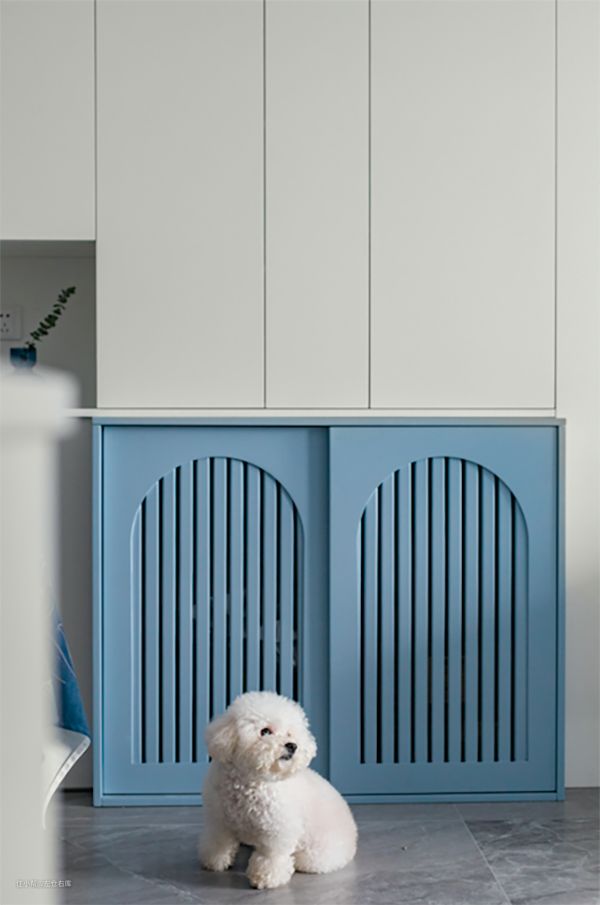 - 考虑毛孩子家庭的需求,狗窝与客厅定制柜结合