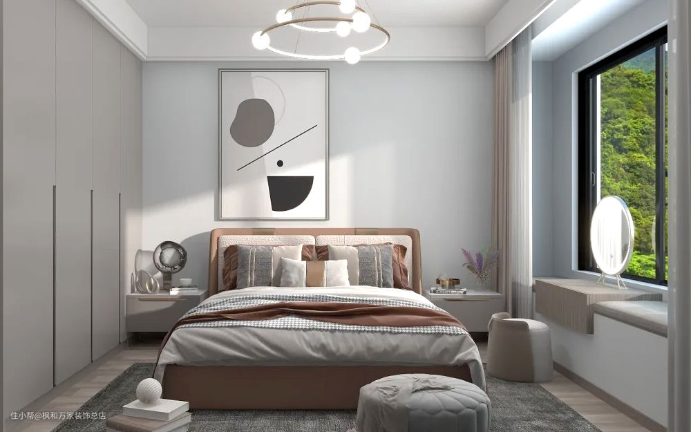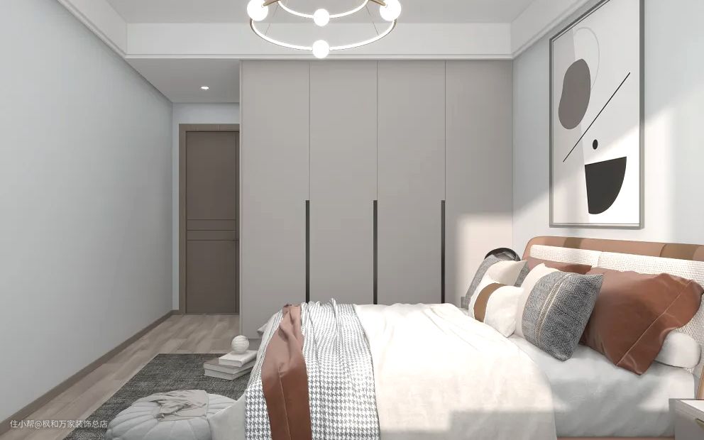 主卧以简约大气、实用舒适为主旨,整体呈现出家的温馨感。后期的软装设计也是恰到好处,与硬装基底相互衬托,共同提升了空间的格调。