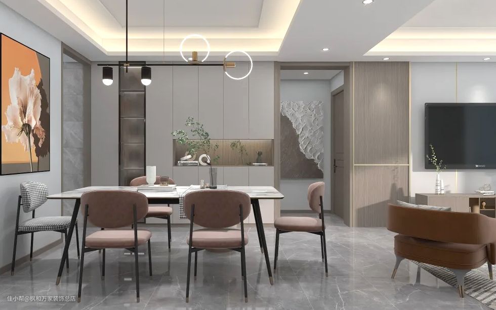 岩板餐桌的大理石纹,白色的嵌入酒柜,玫粉色餐椅,平淡而不庸俗的生活状态。