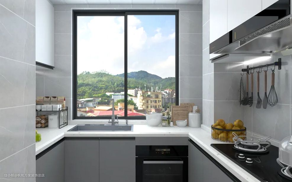 U型橱柜设计,厨房空间得到充分的利用。橱柜白色烤漆门板,墙地面的米色纹理瓷砖衬托白色无挡水边的台面,极致简约的厨房空间。