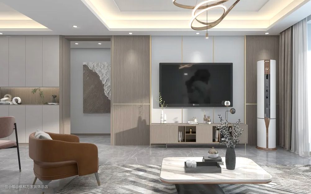 客厅以灰色系地砖搭配实木背景,干净利落,同时用原木色木饰面来中和石材的冰冷感,精致而不失温暖。