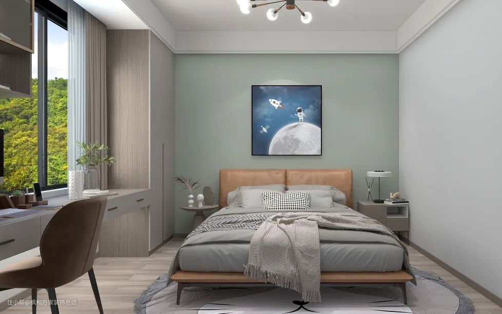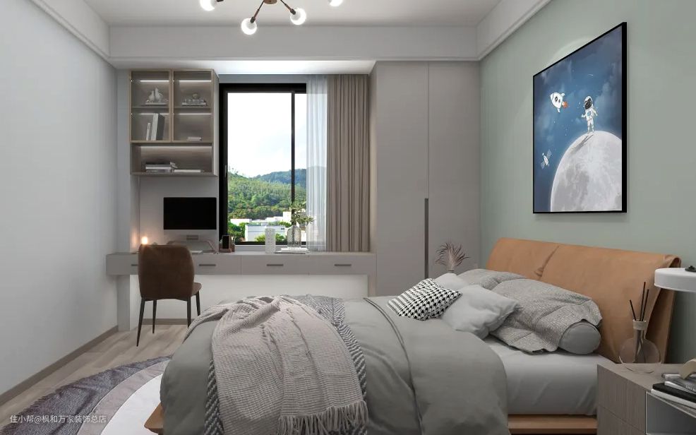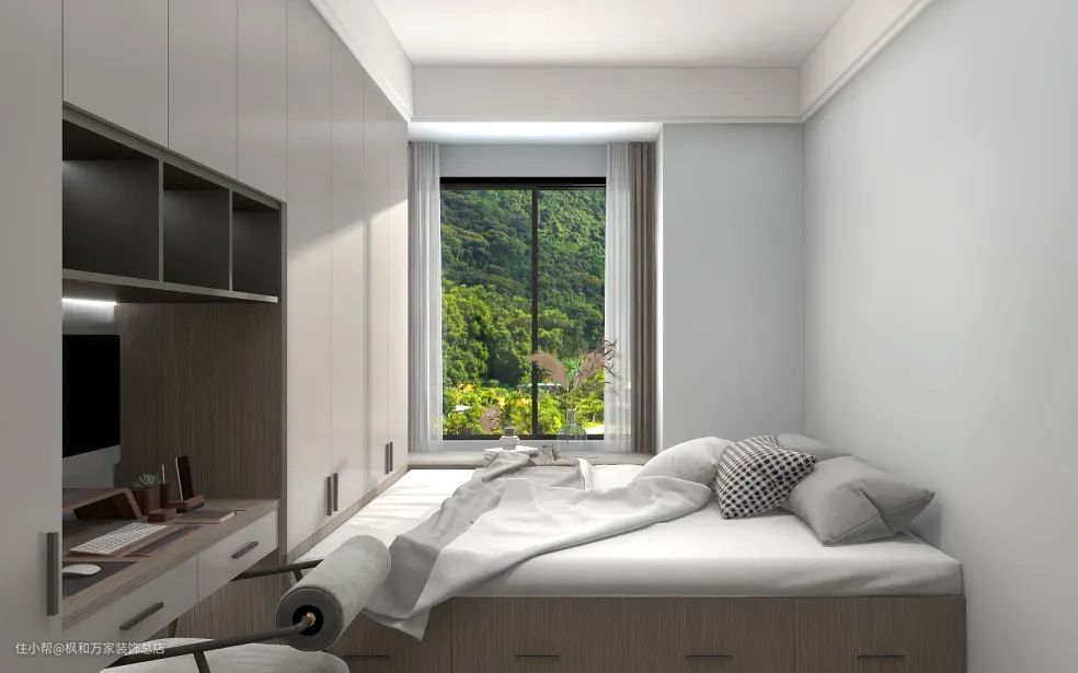 次卧是父母的房间,走进这个空间给人的第一印象就是朴实无华,自然舒适的,淡雅温润的色彩,更有助于营造良好的睡眠环境。