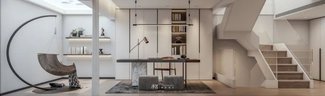 此套案例中,沿着设计感十足的玻璃扶手的楼梯走到书房中,整个氛围非常自在,配上休闲摇椅,让居家办公变得惬意轻松。