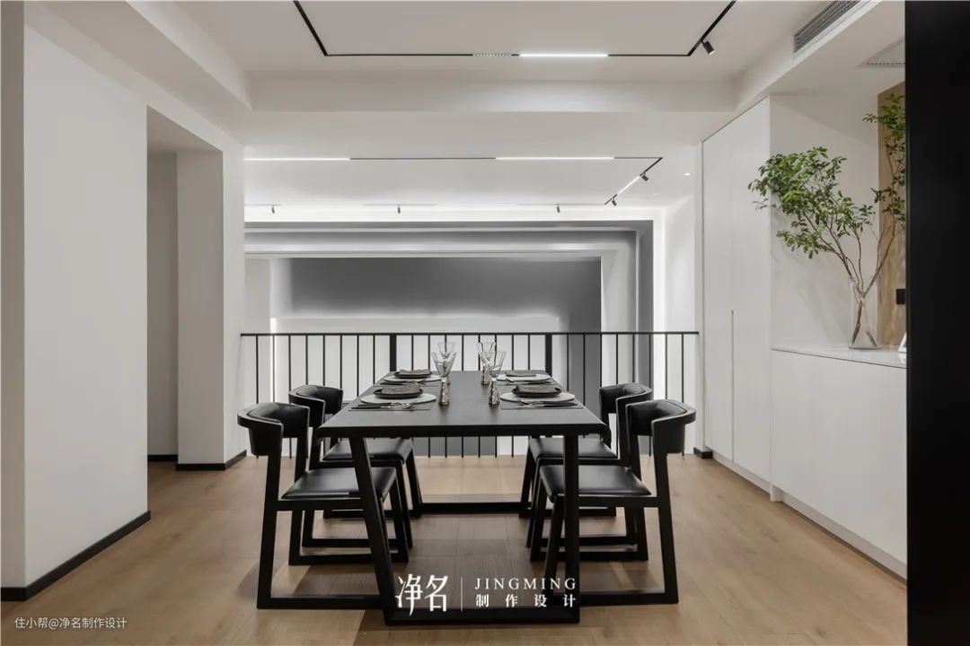 而设计厨房和餐厅设置在夹层中,餐厅的设计,大气又不失简洁,融入了现代时尚的元素,高质感十足的黑色餐桌椅与原木地板相得益彰,营造出一个轻松舒适的就餐环境。