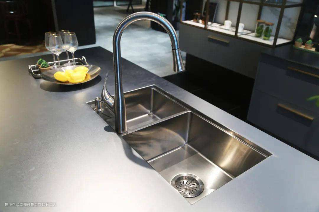 不锈钢的表层看起来非常的干净整洁,并且不锈钢台面可以和水槽做成一体式,方便打扫,酒店餐厅都钟爱,做饭产生的油污用抹布简单擦拭就清洁掉了,并且防水、耐热(内包的是防火板)。