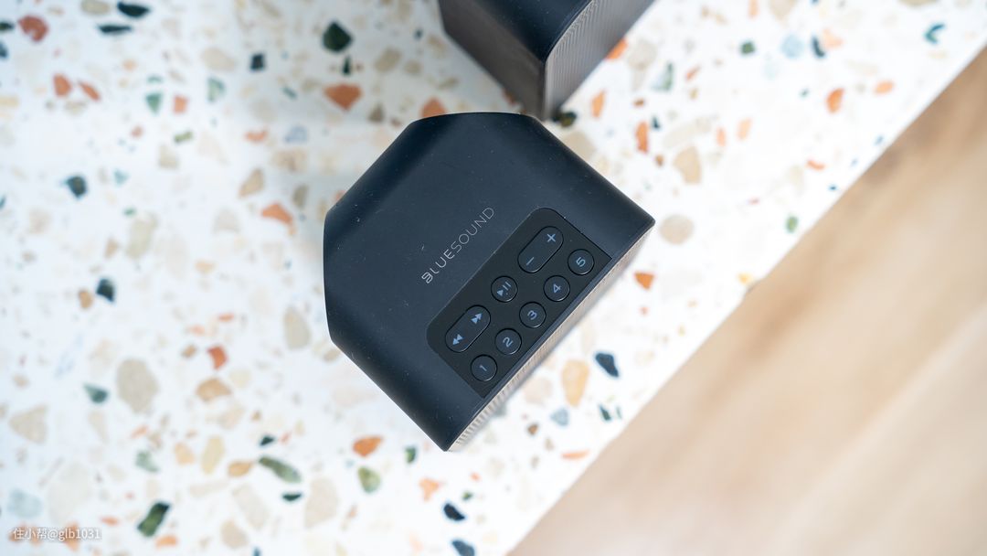BLUESOUND PULSE FLEX 2i的控制区域设计在机箱顶部,实体按键的设计可以实现精准的音量控制。除了常规的切歌、播放/暂停、音量调节之外,可以看到还有五个数字按键。可以在APP内进行快速设定。