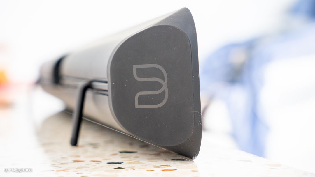外观上,BLUESOUND SOUNDBAR 2i箱体背面采用磨砂手感,触感很舒服。两侧还有BLUESOUND 品牌logo,这部分采用的是类肤触感的材质手感出色,不过因为材质也较为容易沾染灰尘,特别是家里如果养的有猫的话就需要经常注意清理了。