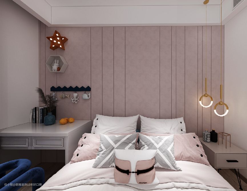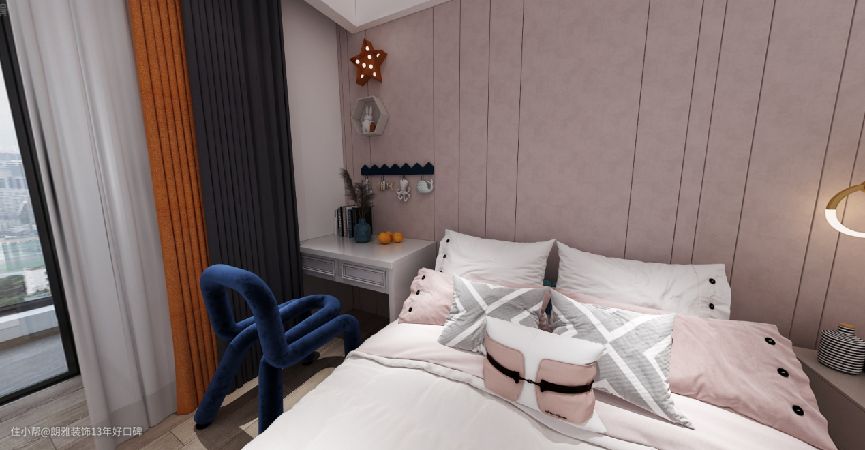 儿童房整体色调为粉色,墙面加入软木板的设计,位于飘窗边的多边形的小角落空间,成为孩子学习的独立天地;墙头挂童趣的装饰,为小公主提供一个温馨童趣空间。