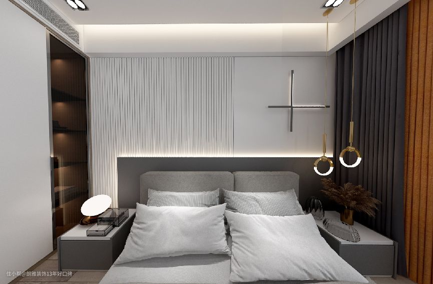 进入主卧室后分层置物架有效帮助居者归纳衣物的使用,茶色玻璃的组合定制柜运用日式的简约风格,白色+透色的演绎,配合设计感吊灯的亮眼点缀,将简约彰显的极致高级。